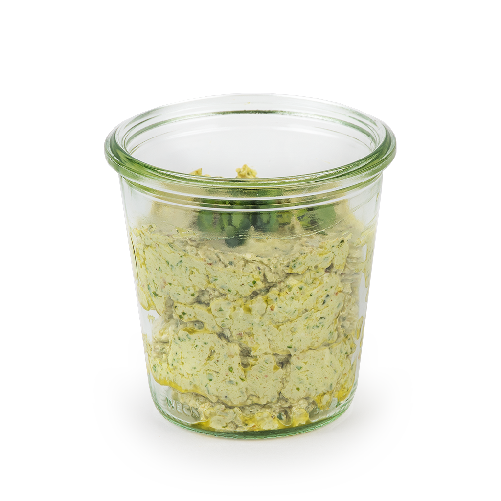 Frischer Genuss mit natürlichem Aroma: Frischkäse und Basilikum-Pesto vereint in einem leichten, aromatischen Aufstrich.