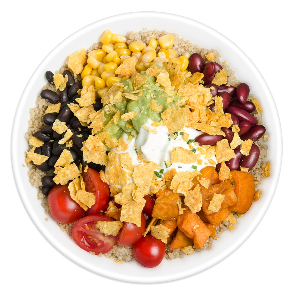 Quinoa, Mais, Kidneybohnen, marinierte Kiechererbsen, Süsskartoffelspalten, Cherrytomaten, Guacamole, Sour Cream, Tortilla, Empfehlung: Salsa Dressing
